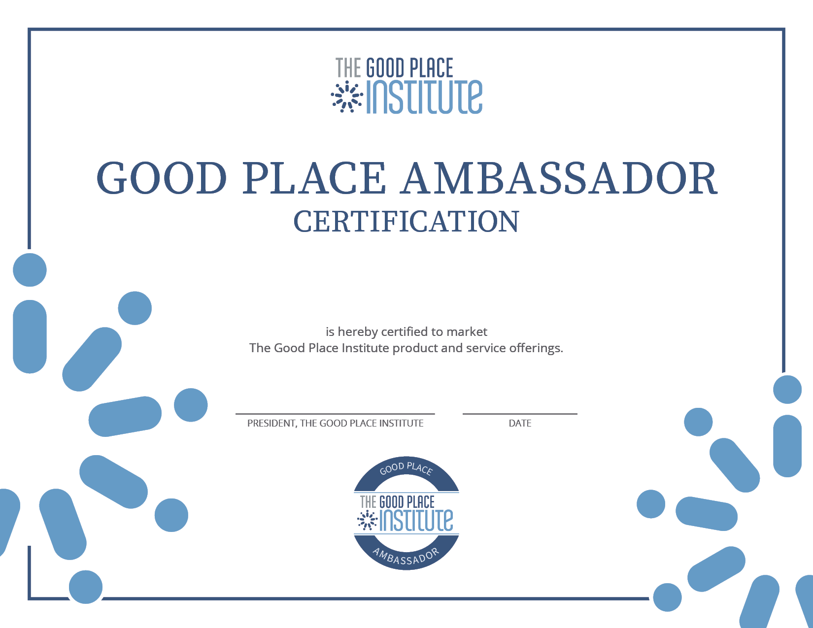 In addition to an exclusive Good Place Ambassador certificate and seal that can be used on your social media profiles or marketing materials, the investment also gives you access to GPI’s intellectual property. This includes assets such as current and updates to marketing materials, sales, and delivery tools, resources, templates, and support as applicable per certification level (Good Place Ambassador, Partner Consultant) and in the applicable area(s) of completed certification; use of brand and logo; photo and bio listing on Good Place Institute web site; collaborative communication calls and events; topic refreshers; discounts on GPI conferences, events, and products.